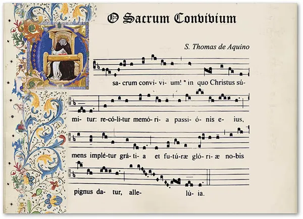 Como vemos en la biografía que abre esta secuencia de artículos sobre el Doctor Angélico, con ocasión de la institución de la solemnidad de Corpus Christi,2 Urbano IV le encargó a Santo Tomás que compusiera el oficio de la celebración. Sin embargo, superando las expectativas, el santo-poeta produjo «una joyita litúrgica que ya ha desafiado siete siglos, y que tal vez sigamos cantando en la eternidad bienaventurada».3 El conjunto de oraciones e himnos que lo forman se considera «lo más tierno, devoto y profundamente teológico que se conoce en la sagrada liturgia».4 De él recogemos el Adoro te devote, el Lauda Sion y el Ave verum, entre otros. Como señala Mons. Biffi, Santo Tomás no sólo supo elaborar magistralmente su teología eucarística, sino que su «contemplación de la Eucaristía fue tan intensa que logró abrir su vena poética e infundió los acentos de la lírica en un impecable y refinado lenguaje dogmático, y de ahí nacieron las secuencias e himnos que todos conocemos y todavía cantamos».5 En este oficio del Corpus Christi encontramos una antífona pequeña en tamaño, pero gigante en contenido: se trata del famoso O sacrum convivium.6 En ella, de hecho, Santo Tomás7 dejó consignada la triple realidad que, como él afirma, todo sacramento abarca; es decir, en relación con el pasado, con el presente y con el futuro de nuestra santificación. Consideremos, por tanto, cada uno de esos aspectos en particular.Institución de la Eucaristía y memorial de la Pasión