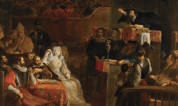 Al oírla, los protestantes exultan, mientras que los católicos, allí presentes para presenciar el martirio, se estremecen, angustiados con la perspectiva de tan escandalosa apostasía.